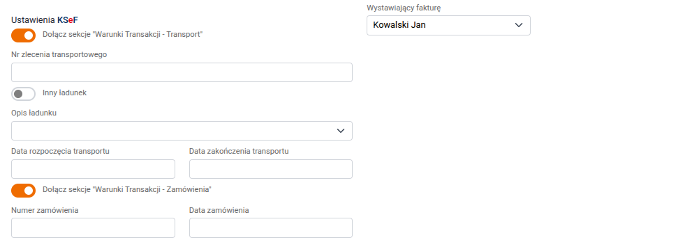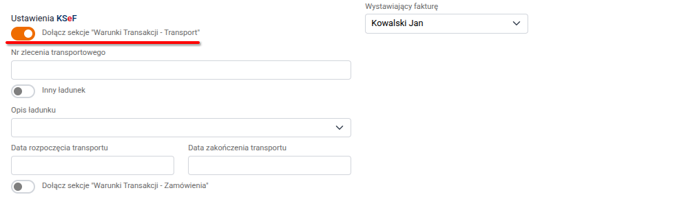 Wychodząc naprzeciw oczekiwaniom naszych klientów, którzy związani są głównie z branżą transportową i spedycyjną, przygotowaliśmy również ważną sekcję „Transport”. Dzięki niej na fakturach rejestrowanych w KseF pojawiają się dodatkowe informacje, których oczekują kontrahenci.